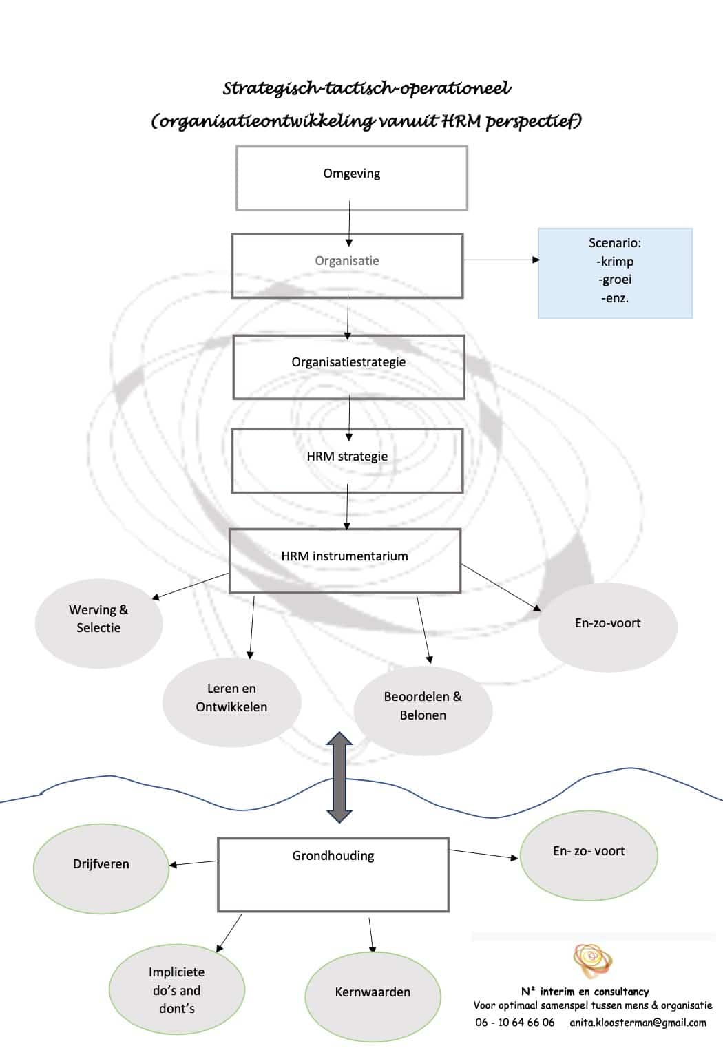 Het model hiernaast kun je als hulpmiddel gebruiken voor diverse doeleinden. Onder andere voor de check op samenhang en wederzijdse beïnvloeding. De weergave is vanuit HRM perspectief maar je kunt hier net zo goed een ander aandachtsgebied of een project als perspectief nemen. Het principe blijft hetzelfde.